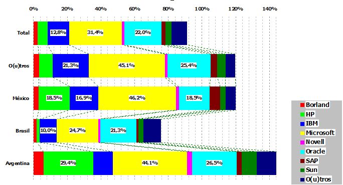 A liderança da Microsoft sobre a Oracle (segunda colocada) varia muito: enquanto no Brasil a Oracle detém 86% do número de alianças obtidas pela Microsoft, no México a participação da Oracle equivale a apenas 40% da participação da Microsoft.
