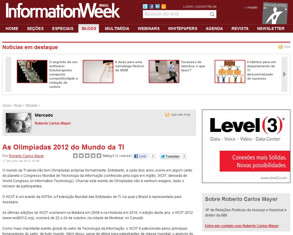 Dentre elas, a mais importante para nós brasileiros, será a reunião de diretoria da WITSA, que deverá escolher a sede do WCIT de 2016: a Assespro apresentou a candidatura de Brasília para sediar essa edição em nosso país. Desde março de 2012, quando foi tomada a decisão de apresentar a candidatura formalmente, um esforço intenso vem sendo desenvolvido em prol dela, visto que há outros países que também se postularam.