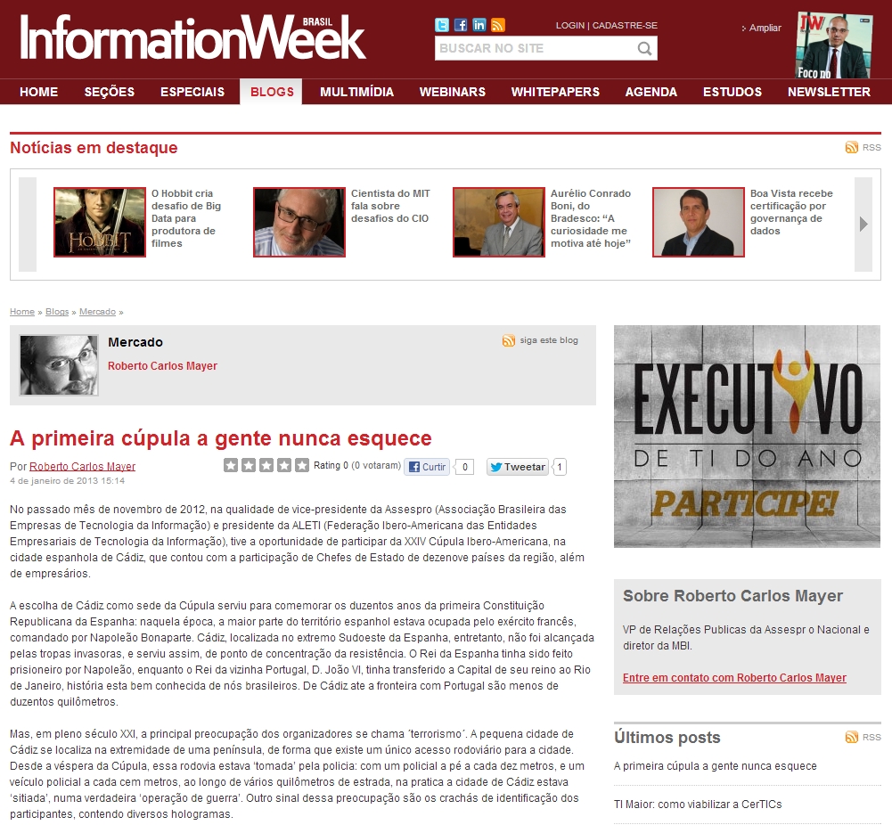 No passado mês de novembro de 2012, na qualidade de vice-presidente da Assespro (Associação Brasileira das Empresas de Tecnologia da Informação) e presidente da ALETI (Federação Ibero-Americana das Entidades Empresariais de Tecnologia da Informação), tive a oportunidade de participar da XXIV Cúpula Ibero-Americana, na cidade espanhola de Cádiz, que contou com a participação de Chefes de Estado de dezenove países da região, além de empresários.
