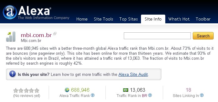 Segundo dados do registro.br, a quantidade total de domínios .br já ultrapassou a marca de 2,3 milhões. Para determinar a posição do nosso site dentro desse universo gigantesco de informação, consultamos o alexa.com: