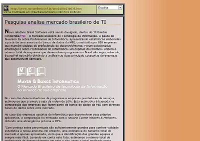 Novo relatório Brasil Software está sendo divulgado, dentro do 3º Boletim FonteMídia/MBI - O Mercado Brasileiro de Tecnologia da Informação. A pauta de fevereiro foi sobre Profissionais de Informática, apresentando estatísticas elaboradas a partir de uma amostra do banco de dados da MBI, constituída por 828 empresas que mantêm equipes de profissionais de desenvolvimento. Foram selecionadas informações sobre Profissionais de Informática, um capítulo do relatório. Embora o número total de empresas que desenvolvem programas no Brasil não seja conhecido, é possível estimá-lo dividindo a análise nas duas principais categorias de empresas que desenvolvem software.