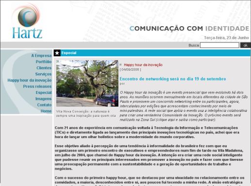 Com o sucesso do primeiro happy hour, que se destacou por uma vivacidade no relacionamento entre os convidados, a maioria, desconhecidos entre si, aos poucos fui tecendo a minha rede. A visão estratégica de que o tema “inovação” iria ter um lugar de destaque nas mentes que se ocupam do desenvolvimento do mundo corporativo, aliada à vivência profissional, como jornalista e empreendedora da HARTZ, foram essenciais. Da mesma forma contribui o uso adequado de novas tecnologias, como o e-mail marketing para os convites e mensagens motivadoras gravadas em MP3, que são agregadas a eles e os transformam em podcast mails, e o website da Comunidade da Inovação, criado para apoiar o projeto (ver abaixo).