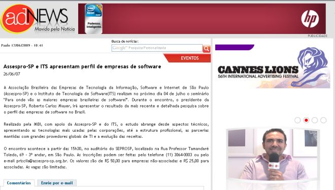 A Associação Brasileira das Empresas de Tecnologia da Informação, Software e Internet de São Paulo (Assespro-SP) e o Instituto de Tecnologia de Software (ITS) realizam no próximo dia 04 de julho o seminário "Para onde vão as maiores empresas brasileiras de software?". Durante o encontro, o presidente da Assespro-SP, Roberto Carlos Mayer, irá apresentar o resultado da mais recente e detalhada pesquisa sobre o perfil das empresas de software no Brasil.