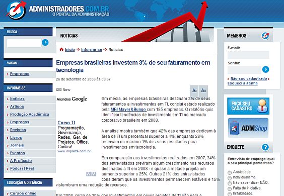 Conteúdo republicado à partir de http://www.administradores.com.br/noticias/empresas_brasileiras_investem_3_de_seu_faturamento_em_tecnologia/17519/