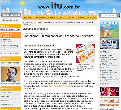 No dia 28 de novembro Itu será sede do Primeiro Encontro de Jornalismo 2.0. O evento celebrará os 200 anos da imprensa no Brasil e discutirá o futuro do jornalismo no meio digital.