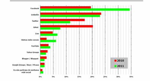 Quanto às redes sociais mais utilizadas pelos profissionais, o estudo cita que o Facebook é a ferramenta preferida dos profissionais, seguida pelo LinkedIn e Twitter (veja gráfico abaixo):