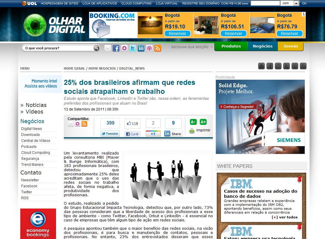2011/09/13 - Olhar Digital - 25% dos brasileiros afirmam que redes sociais atrapalham o trabalho