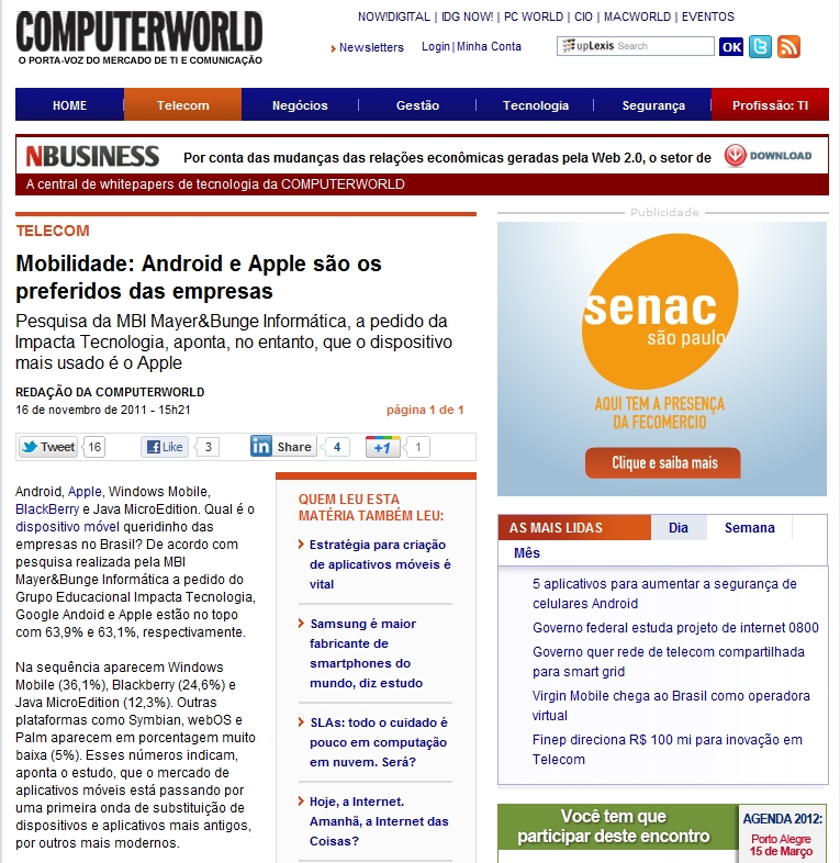 2011/11/16 - ComputerWorld - Mobilidade: Android e Apple são os preferidos das empresas
