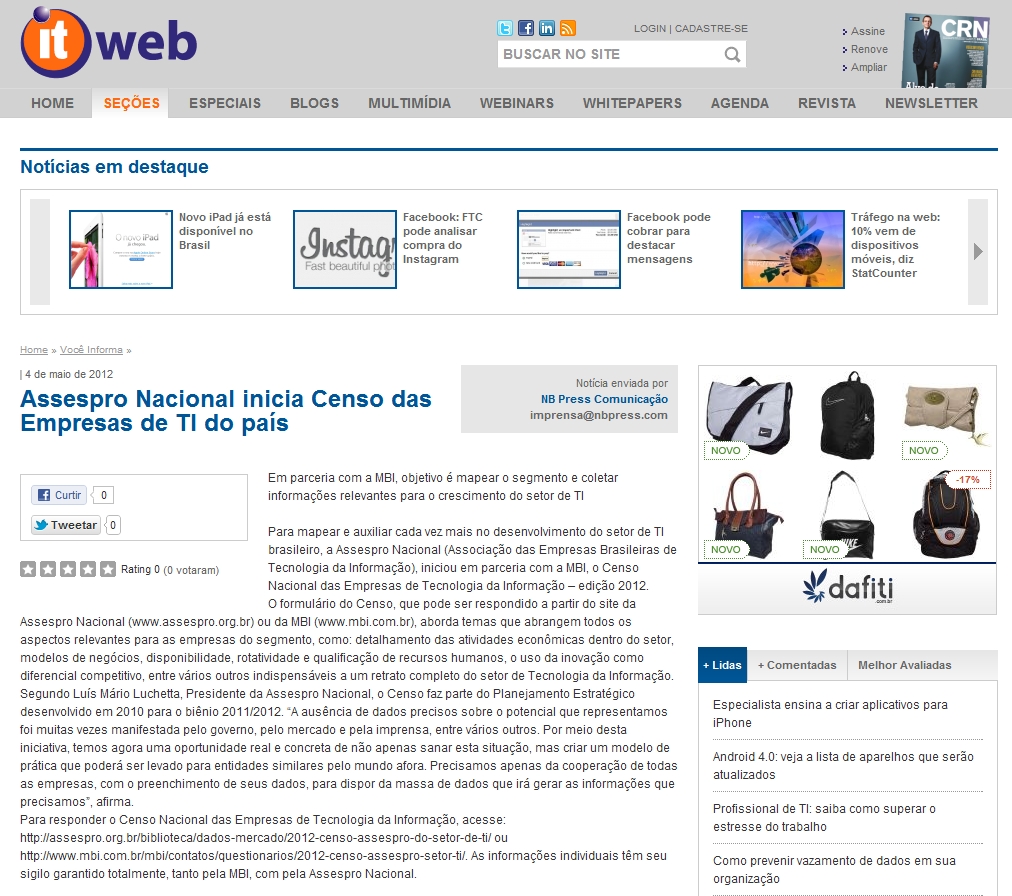 2012/05/04 - IT Web - Assespro Nacional inicia Censo das Empresas de TI do país