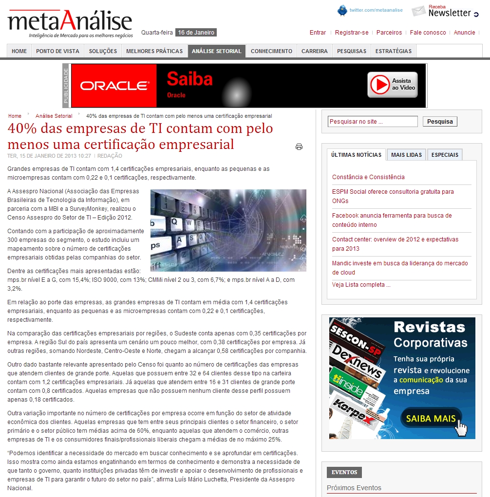 2013/01/15 - MetaAnalise - 40% das empresas de TI contam com pelo menos uma certificação empresarial