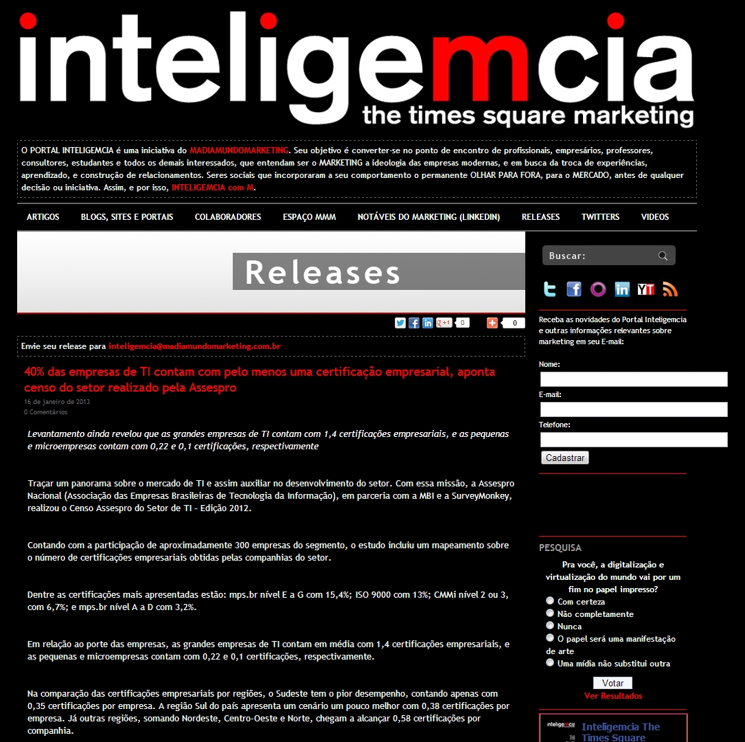 2013/01/16 - Inteligemcia - 40% das empresas de TI contam com pelo menos uma certificação empresarial, aponta censo do setor realizado pela Assespro
