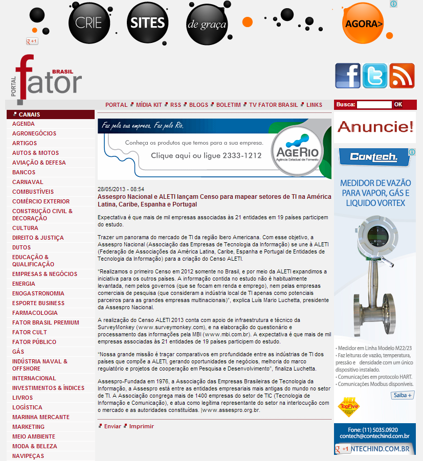 2013/05/28 - Fator Brasil - Assespro Nacional e ALETI lançam Censo para mapear setores de TI na América Latina, Caribe, Espanha e Portugal