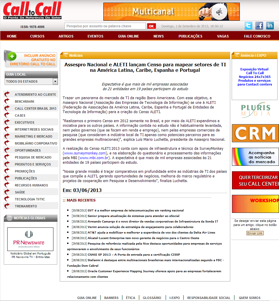 2013/06/03 - Call to Call - Assespro Nacional e ALETI lançam Censo para mapear setores de TI na América Latina, Caribe, Espanha e Portugal