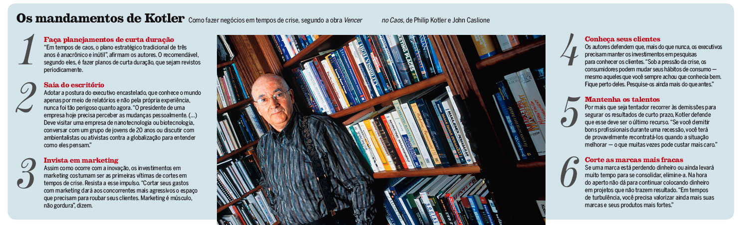 Após uma estonteante sucessão de más notícias, o mundo enfim avista indícios de que o pior da crise econômica pode ter ficado para trás. Ainda é cedo para dizer, porém, quanto tempo vai levar até que todos voltem a respirar com tranquilidade - se é que algum dia isso vai acontecer. Em Vencer no Caos (Editora Campus-Elsevier), que chega às livrarias americanas e brasileiras no dia 15 de maio, o guru americano Philip Kotler e o consultor de estratégia John Caslione selam um veredicto nada alentador. Segundo eles, mesmo se a turbulência passar logo, o alívio será temporário. O próximo susto pode ser tão grande como o que se viu agora - capaz de reduzir algumas das maiores companhias do mundo a pó e, em poucos meses, atingir todo o planeta. "A economia em geral começa a retornar a condições ‘normais’, mas, na nova era em que vivemos, a turbulência se torna uma condição permanente", disse a EXAME Philip Kotler, que aos 79 anos é considerado o pai da teoria moderna de marketing.
