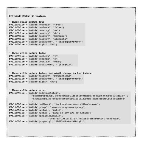 The 'Valid' API will return either 'true' or 'false', telling if the value passed in follows the rules for values of the specified type. However, it is important to note that the last block of code depicted the figure contains calls to the 'Valid' API which will return an error code (instead of 'true' or 'false'), in order to preserve security (note that the 'Valid' API does not require any kind of identification of who is calling it). The 'Valid' API will refuse giving out data about the structure of solutions (including methods, parameters, callbacks, properties, and so on) and about type values representing security tokens (like solution tokens or operation handles): these are Validated using other APIs, that can be called only by logged in users.