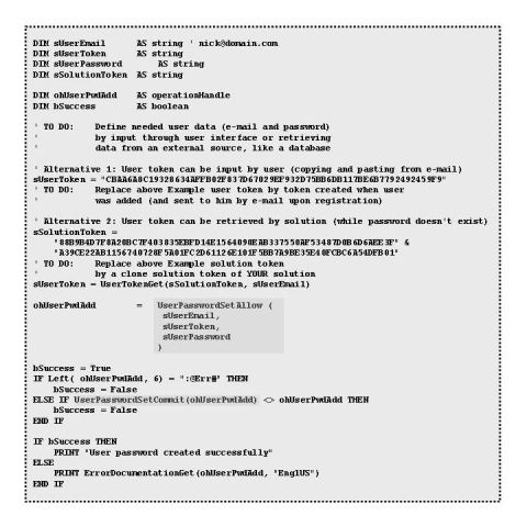 Once a user has been registered, it is necessary he creates his password (before being able to log in). This lesson's code displays the password definition transaction, started with a call to the 'UserPasswordSetAllow' API and confirmed by a call to the 'UserPasswordSetCommit' API.