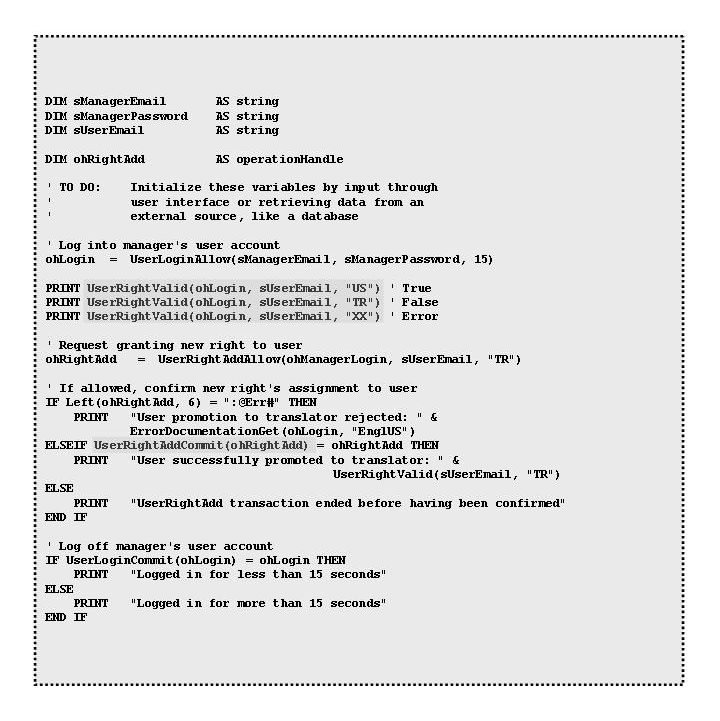 In order to assign a new right to a specific user, the 'UserRightAddAllow' and 'UserRightAddCommit' APIs must be used. They require login by another user, which we call the 'managing' user in the example depicted in the Figure. Success of assigning this new right to the specified user is decided by our single entry point engine based on the internal rights grant table, explained in detail by the technical note on user rights.