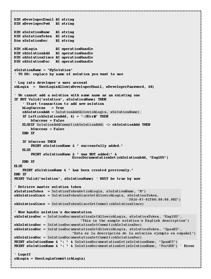 Before logging the user off, the sample code in the Figure demonstrates the usage of the 'SolutionDocumentationSetAllow', 'SolutionDocumentationSetCommit' and 'SolutionDocumentationGet' APIs to ask for and modify the solution's 'documentation', which contains a description of the solution in as many specific human languages as necessary.