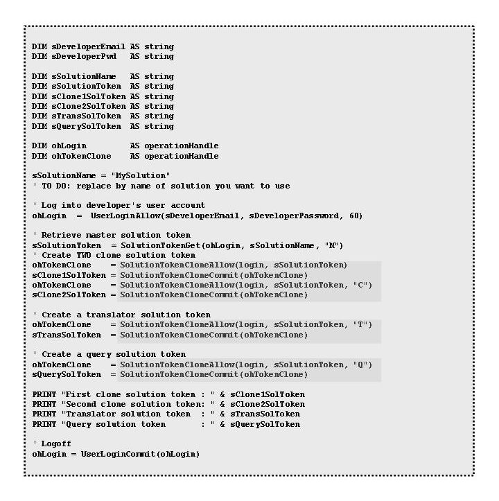 As depicted in this lesson's sample code, (only) the developer that created the master solution token can create cloned tokens (in fact, as many as he wishes). Supposing that the master token creator is the development team's manager, responsible for structuring a solution, he can create various clone solution tokens for different parts of his team to use when calling the solution's functionality from end-user software, as illustrated by the first two transactions delimited by calls to APIs 'SolutionTokenCloneAllow' and 'SolutionTokenCloneCommit'.