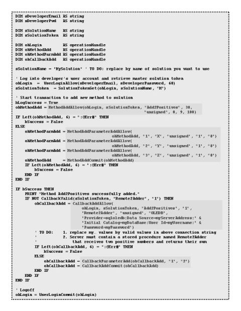 Once a solution has been defined, the next step is adding functionality to it that is called 'methods'. This operation is depicted in this lesson's sample code: its first step consists in the usage of the 'MethodAddAllow', 'MethodAddParameterAddAllow' and 'MethodAddCommit' APIs to define the method in detail: each method has the same attributes as any of the APIs defined by our transaction manager, like a name, a return type (with minimum and maximum length), cost to be charged to the user, maximum running duration, and so on. Adding parameters must be done one by one (in the example, we have three parameters), informing the parameter's name, numeric ID, type, and minimum and maximum length. If the 'MethodAddCommit' API call succeeds, then the method has been created. Each solution can include as many methods as necessary.